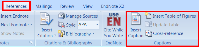 - Select your figure, then go to the “References” menu and click “Insert caption”. It defaults to “Figure 1” but you can name it however you like.